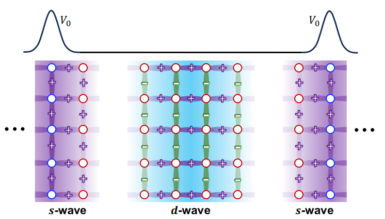 通过将量子蒙特卡罗与密度矩阵重整化群模拟相结合,研究发现在非均匀的哈伯德模型上不同的电荷条纹周期P在决定不同超导配对对称性的出现方面发挥了意想不到的作用。有趣的是,d波超导配对在P≥4系统中始终占主导地位;而P≤3时,扩展的s波和d波都有可能占据主导地位(图1)。当P=3时,他们发现空穴掺杂浓度δ与电荷条纹振幅V0之间的相互作用可以实现一种有趣的d-s波转变。这一有趣的现象源于电荷条纹诱导的畴壁,它形成了一种不同寻常的选择规则(图2),分别在条纹区域附近和远离条纹区域产生s波和d波,因而具有了转变的临界周期(即P= 3)。值得注意的是,在这个转变过程中,d波超导配对转变为配对密度波,并与s波超导配对竞争。此外,伴随着d-s 波的转变,系统的磁关联也随之发生改变,表明了电荷条纹序、超导配对和磁关联之间的复杂联系。