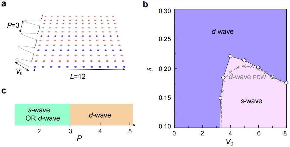 图1:(a)周期P= 3的非均匀哈伯德模型的晶格结构;(b)DQMC计算的具有电荷条纹周期P= 3的非均匀哈伯德模型的相图;(c)主导配对对称性依赖于P,其中P = 3是一个临界值。